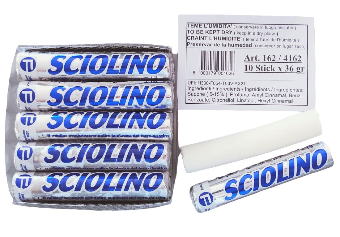 SCIOLINO, es la nueva idea para limpiar la placa de la plancha (tanto normal como a vapor) y liberarla de cualquier depósito de almidón, almidón y fibras.